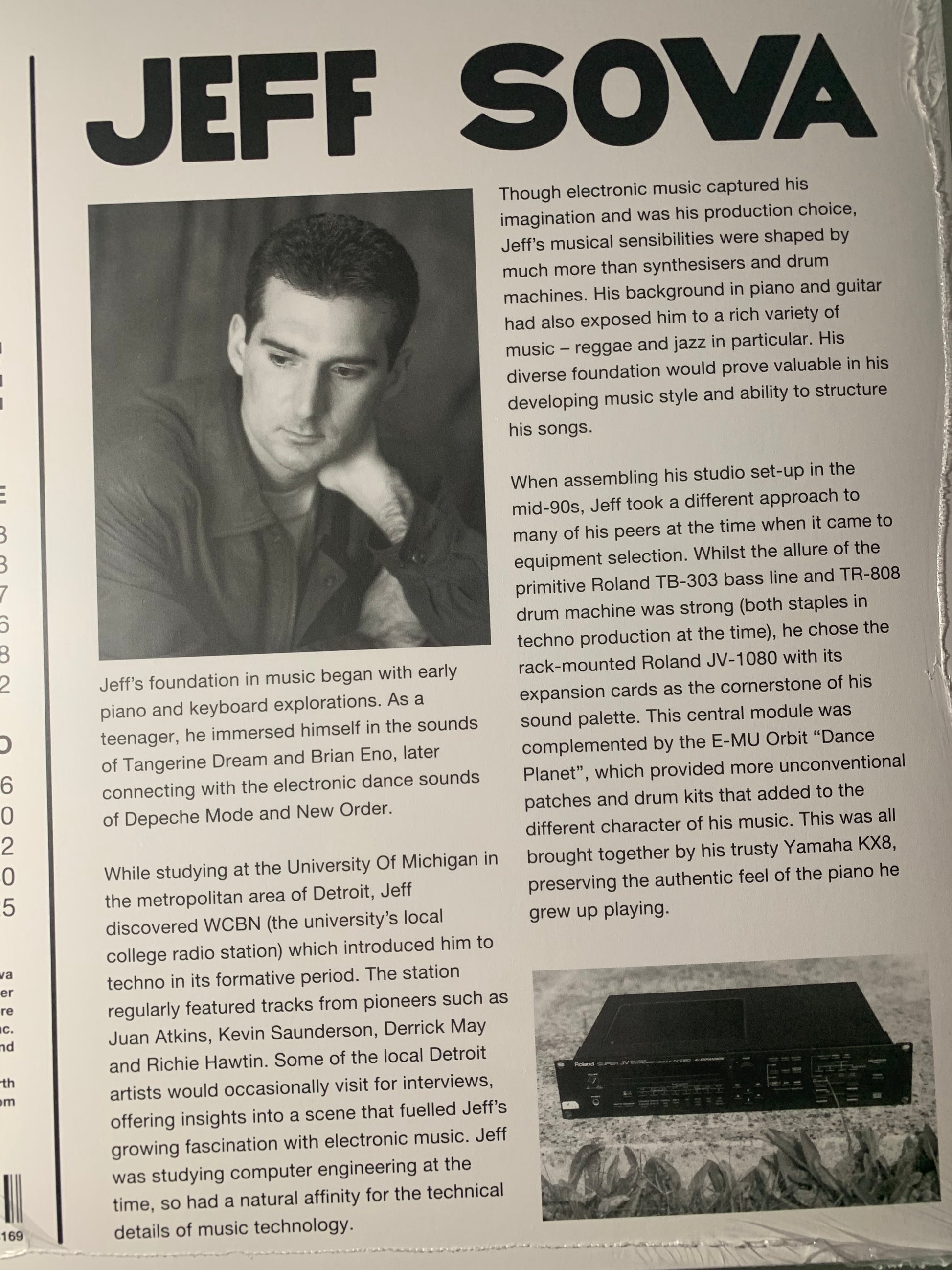 While studying at the University of Michigan the metropolitan area of Detroit, Jeff discovered WCBN (the university's local college radio station) which introduced him to techno in its formative period. The station regularly featured tracks from pioneers such as Juan Atkins, Kevin Saunderson, Derrick May and Richie Hawtin. Some local Detroit artists would occasionally visit for interviews, offering insights into a scene that fuelled Jeff's growing fascination with electronic music. Jeff was studying computer engineering at the time, so had a natural affinity for the technical details of music technology.